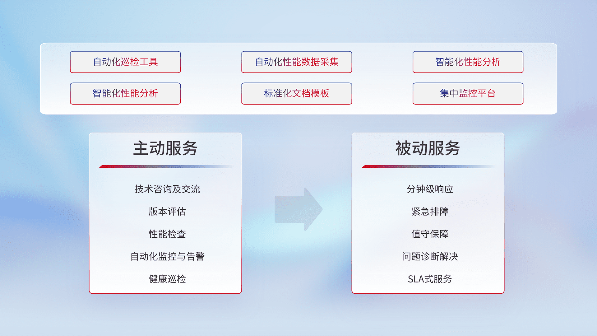 智能化工具和标准化文档,,,保障服务质量,,,,提供主动服务(包含技术咨询、、版本评估、、、性能检查、、、、自动化监控与告警、、、、健康巡检)和被动服务包含(分钟级响应、、、紧急排障、、、、值守保障、、问题诊断解决、、、SLA服务)。。。。