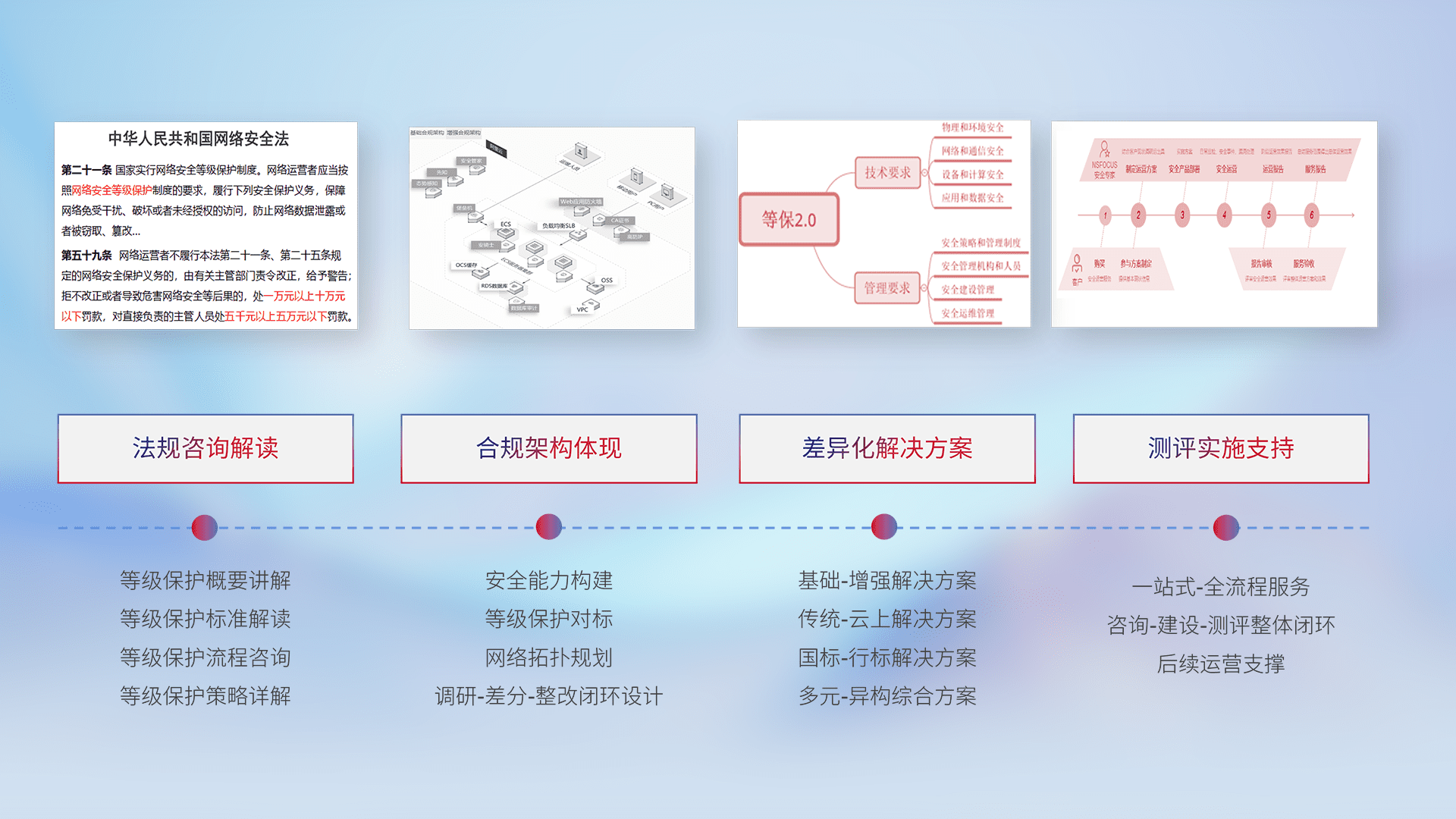 通过专业的法律咨询解读、、、合规架构体现、、、、差异化解决方案、、测试实施支持等服务,,为客户量身打造等保合规体系。。。。